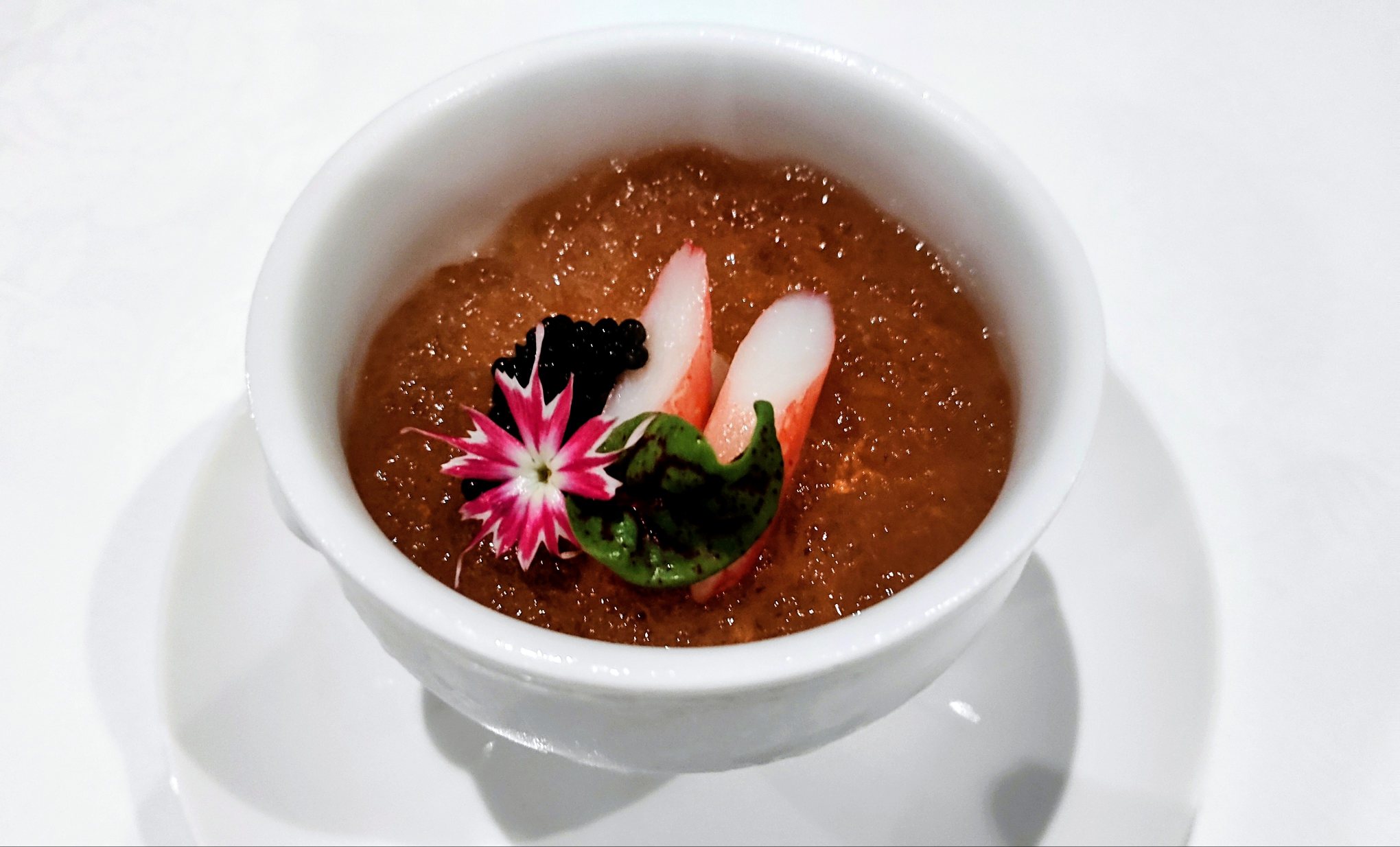 なめらかなペースト状の上にコンソメジュレとキャビアとカニ。