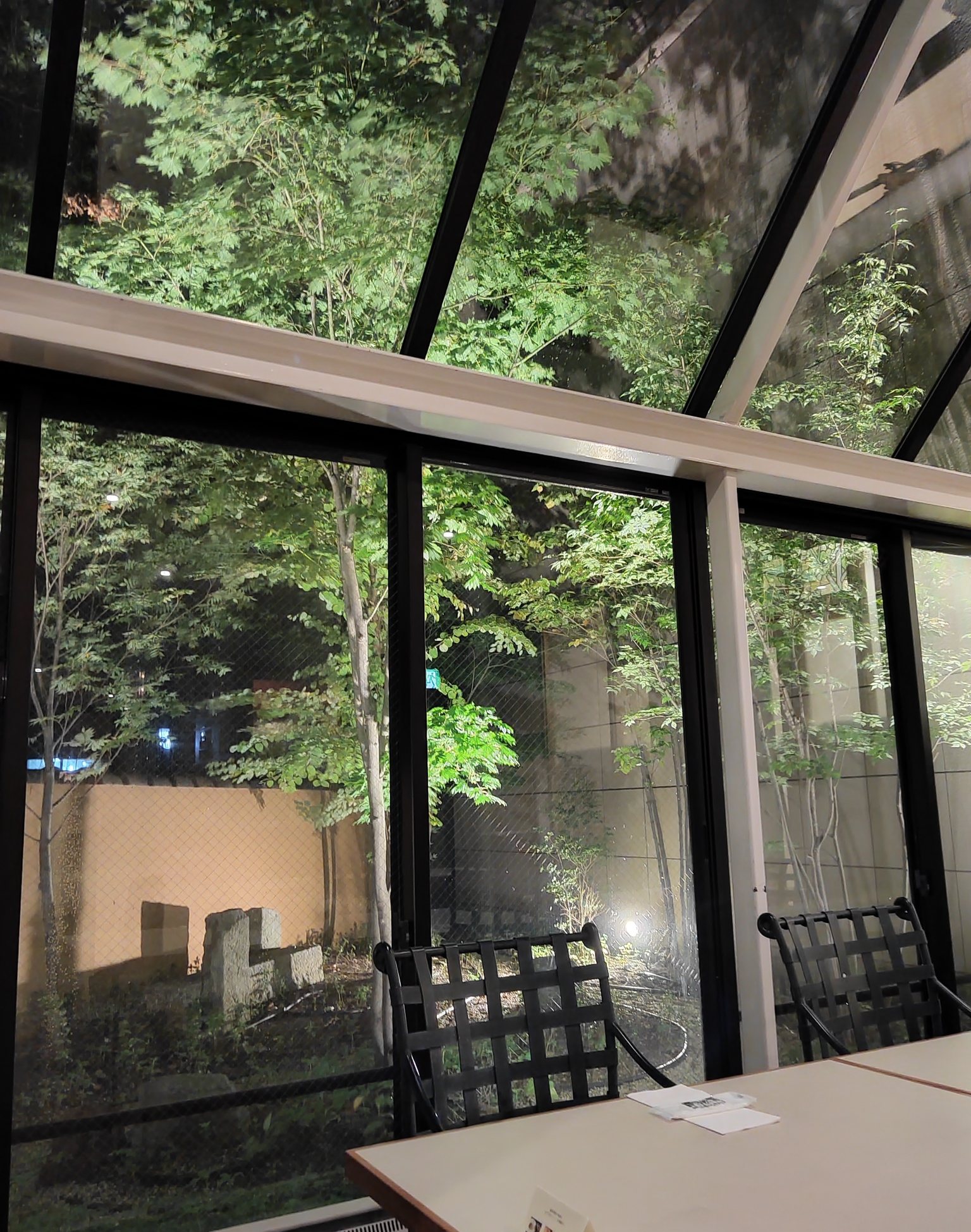 ガラス張りできれいなお庭が見え、