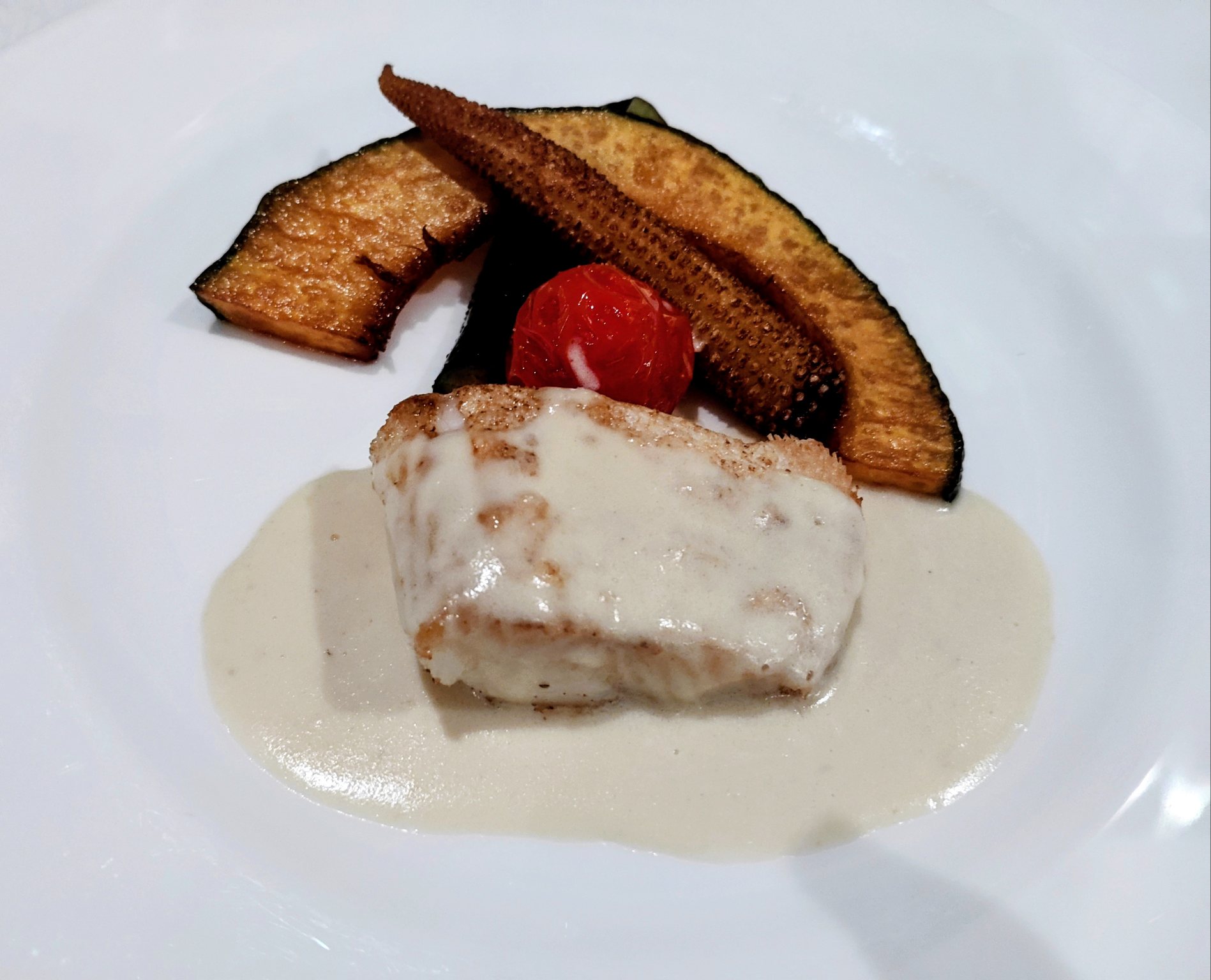 やわらかな白身魚。ソースがかけてあるのにかわがパリッとしていて、