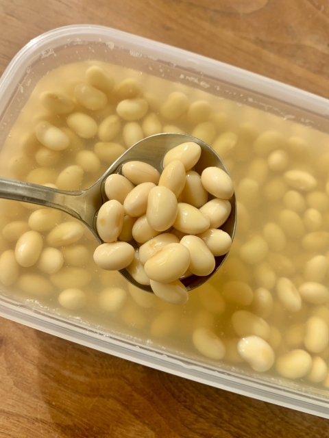 大豆はさっそく水に浸し、煮て、こんなふうに保存。