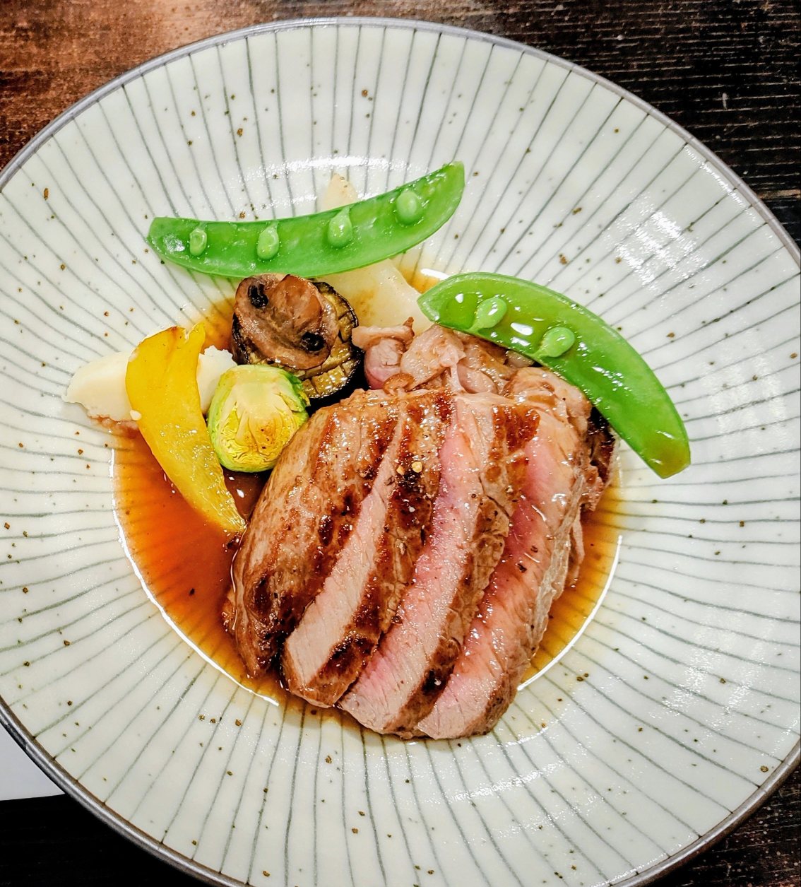 次に運ばれてきたメインのお肉は、地元のお醤油とシェフオリジナルソースで味付けされ、