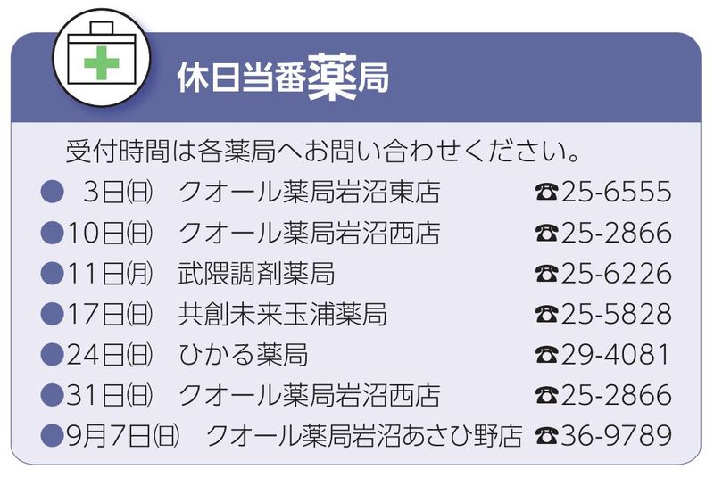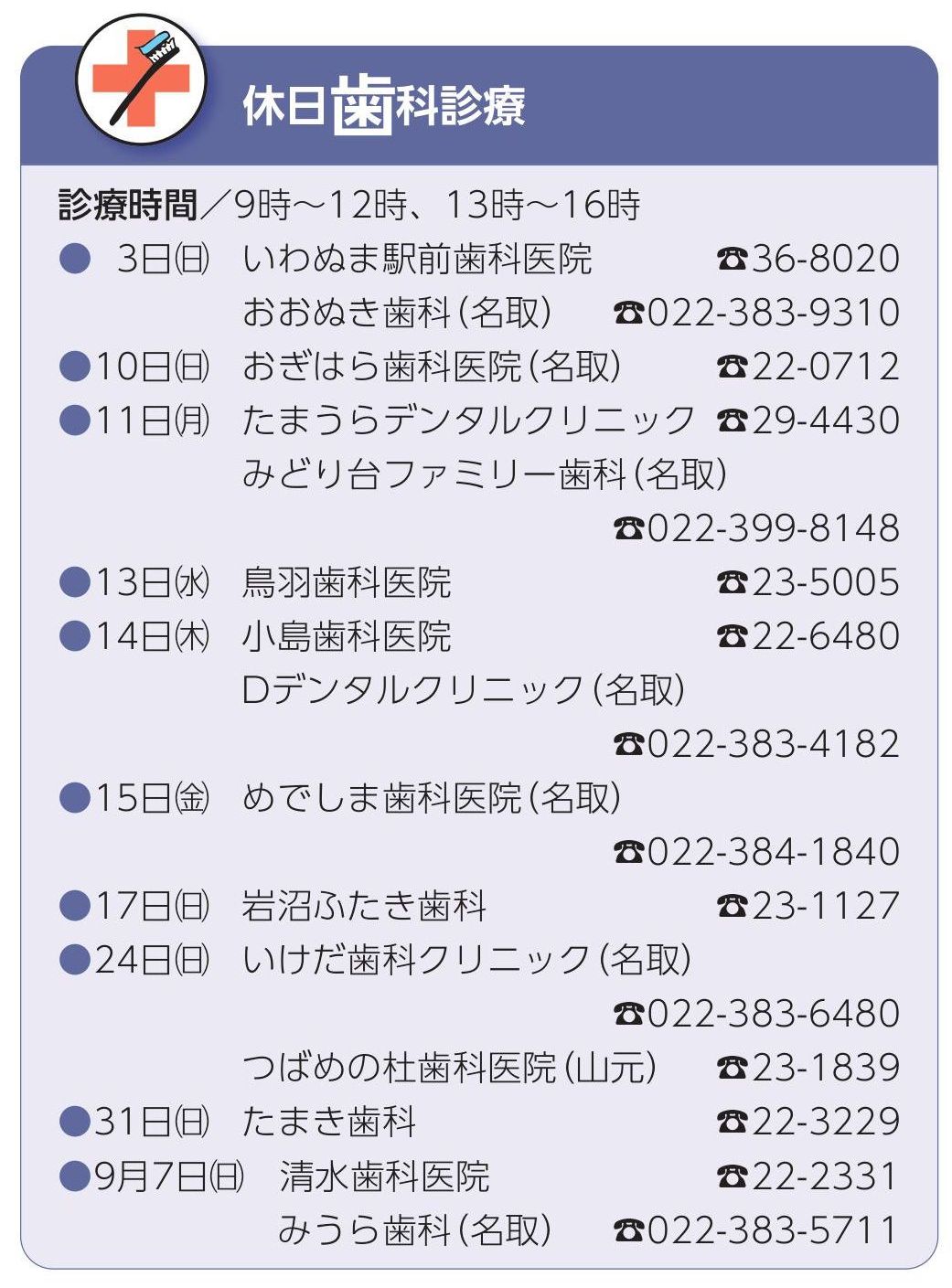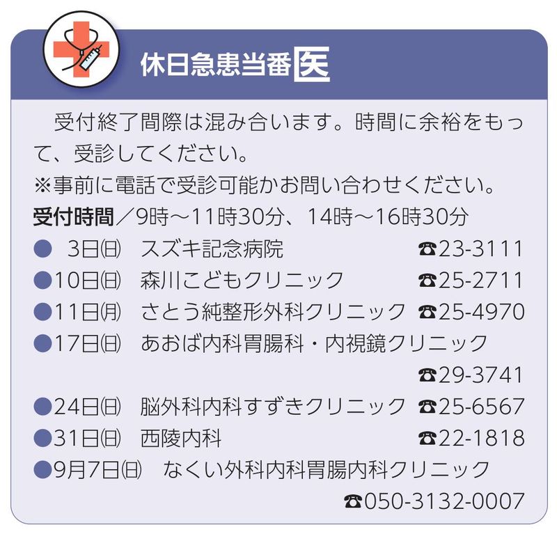 2025年8月 宮城県岩沼市の休日急患当番表をお届けいたします。