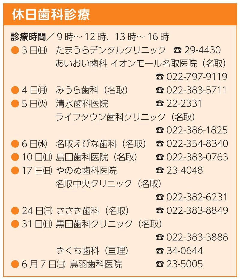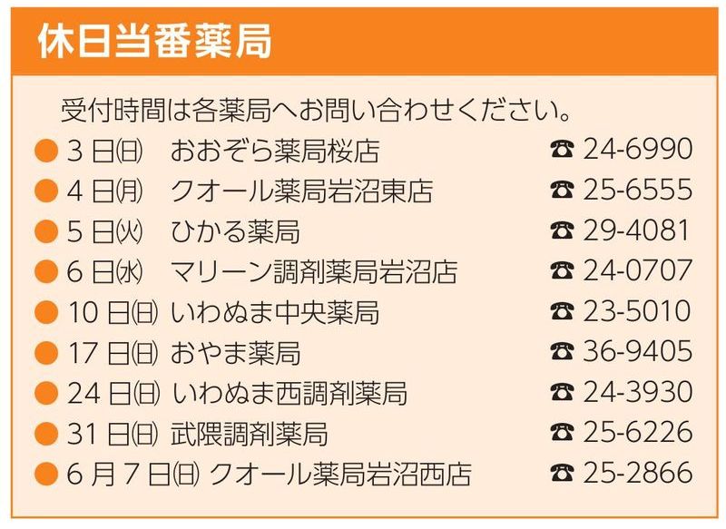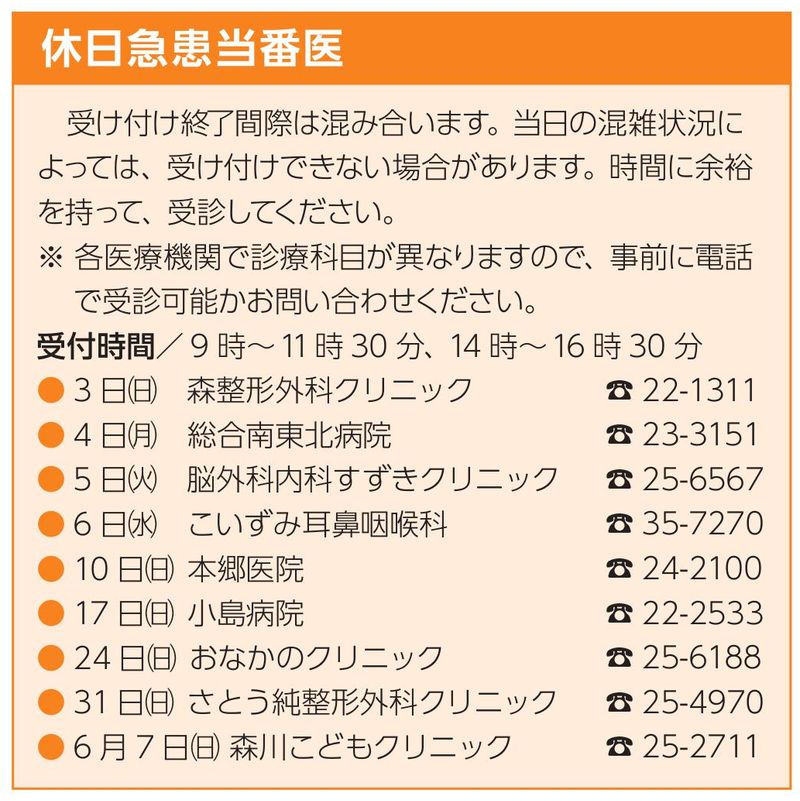 2026年5月 宮城県岩沼市の休日急患当番表をお届けいたします。