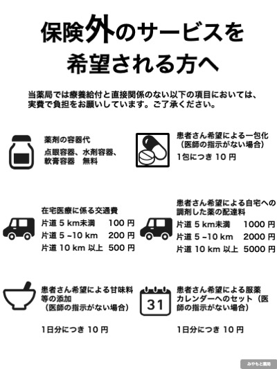当薬局では療養給付と直接関係のない以下の項目においては、実費で負担をお願いしています。