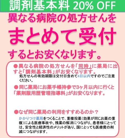 ●異なる医療機関の処方箋を同時に受付すると調剤基本料が割引されます。