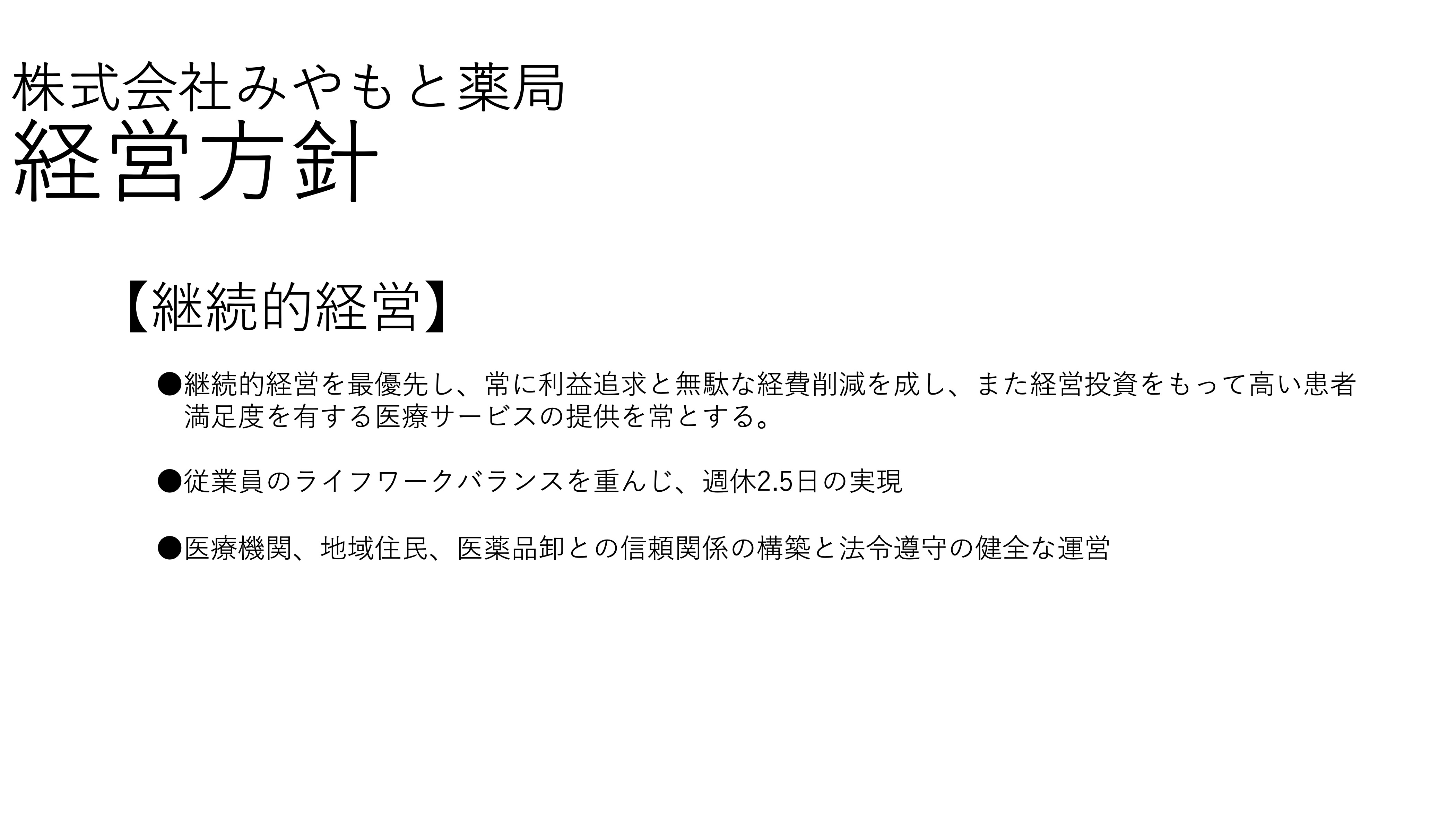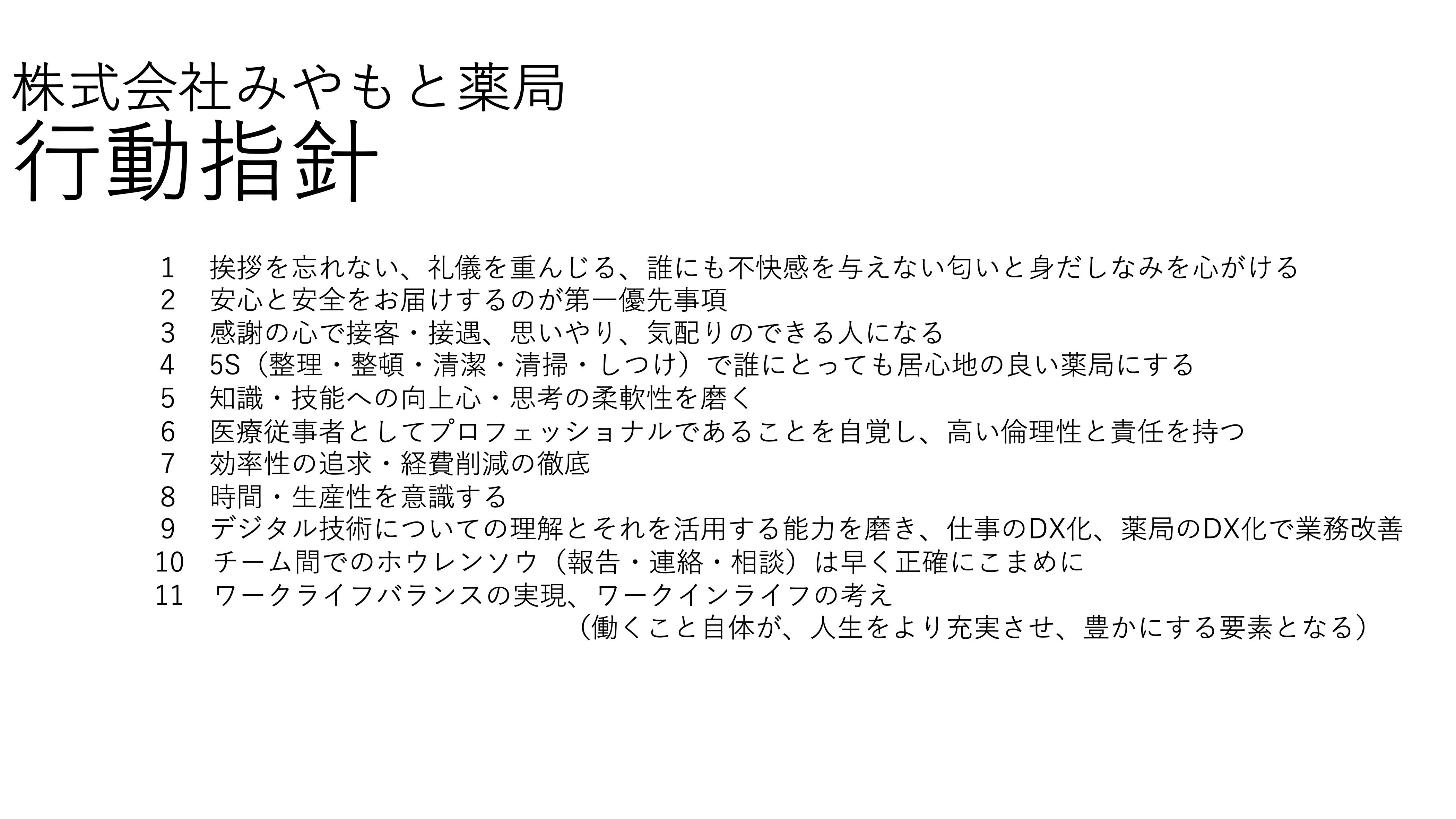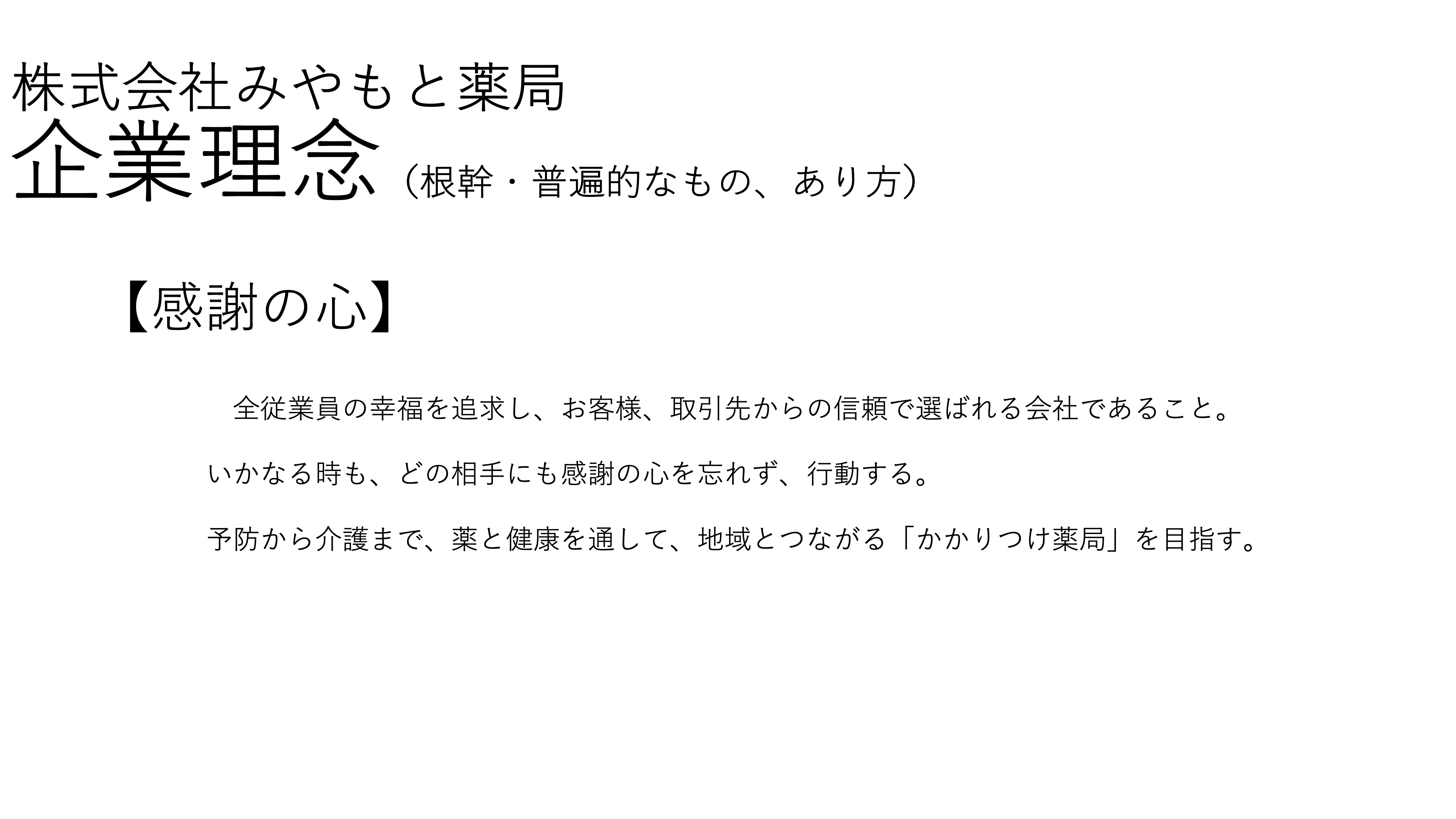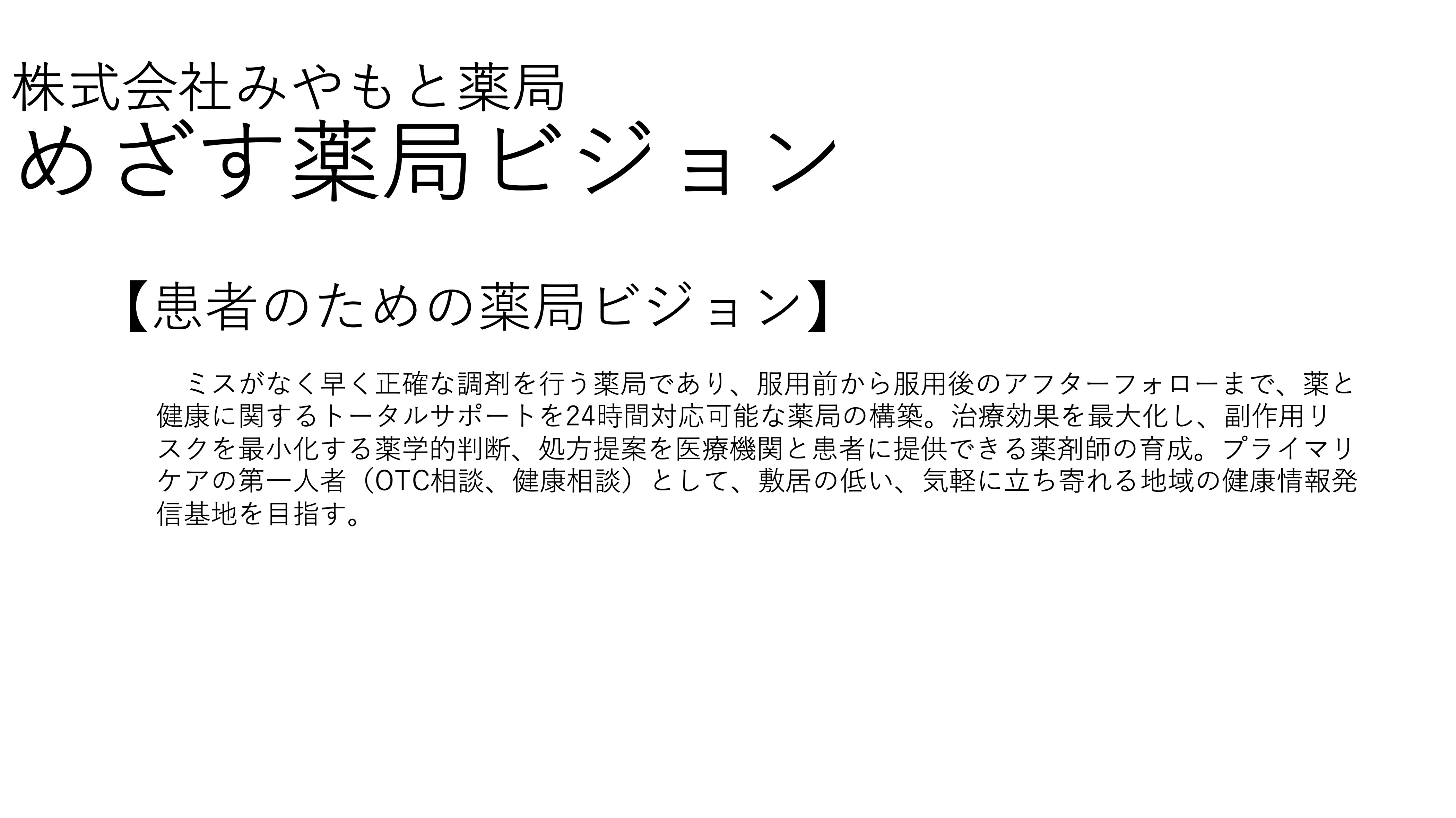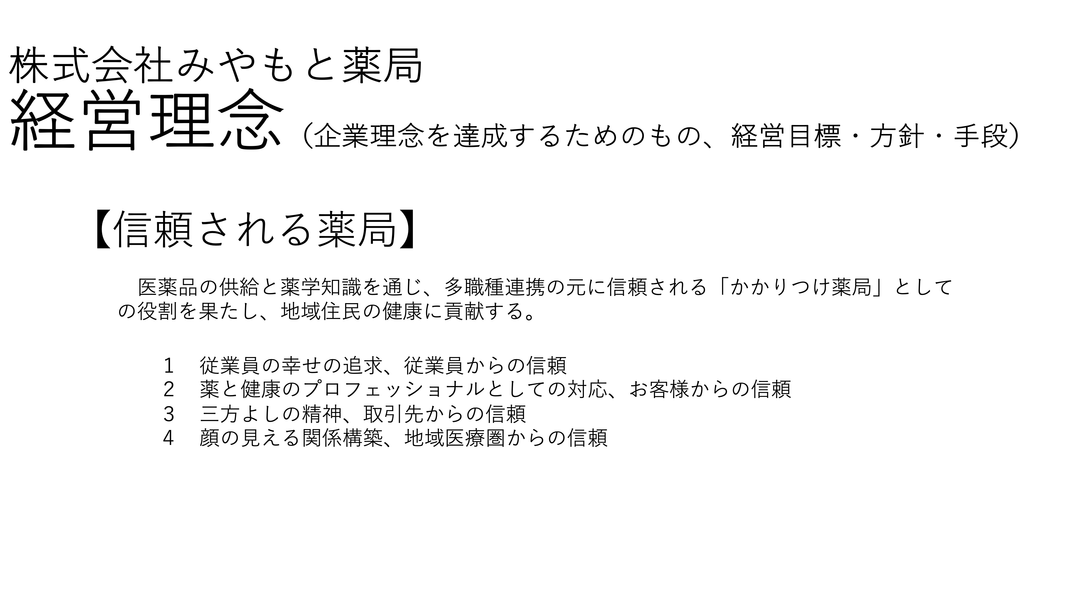 株式会社みやもと薬局の企業理念やめざす薬局ビジョンです。