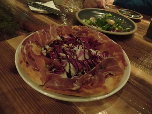 食べ物はと・・・ピザを食べようとなりましたが、生ハムと?何か聞いた事のないカタカナが書かれています。構わず注文。出てきたのがこれ